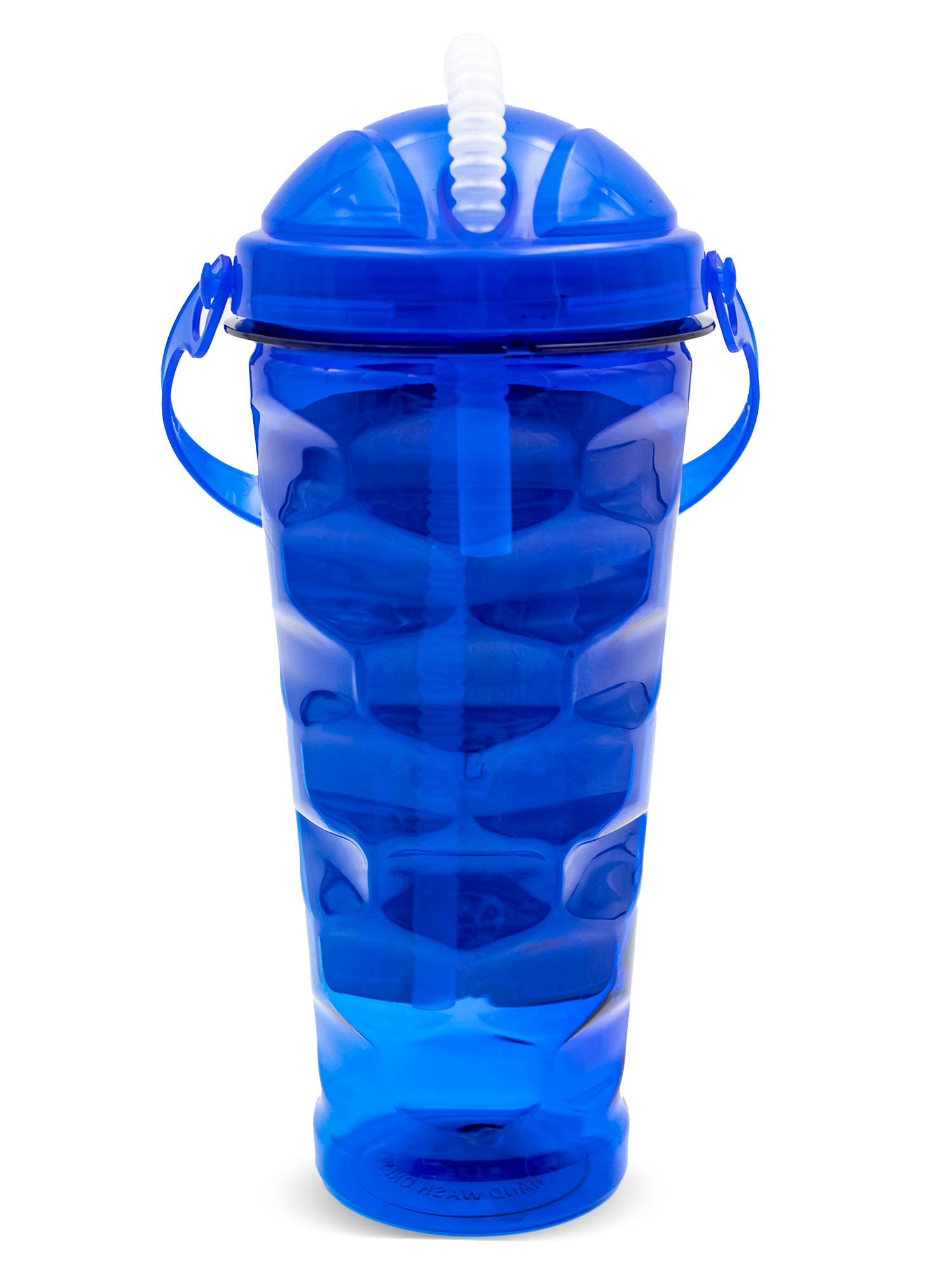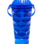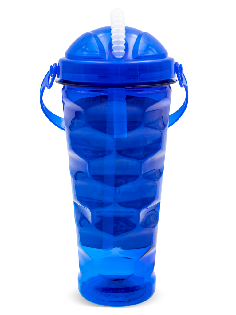 This 26 ounce sipper bottle comes with a threaded lid, corrugated plastic reusable straw and a detachable top handle allowing it to be attached to backpacks, strollers, etc. for easy carrying. Molded with #1 recyclable PET.