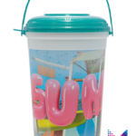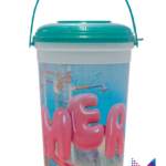 This new 85 ounce bucket with lid and handle is a larger version of our classic popcorn bucket. Buckets nest for easy shipment and storage.