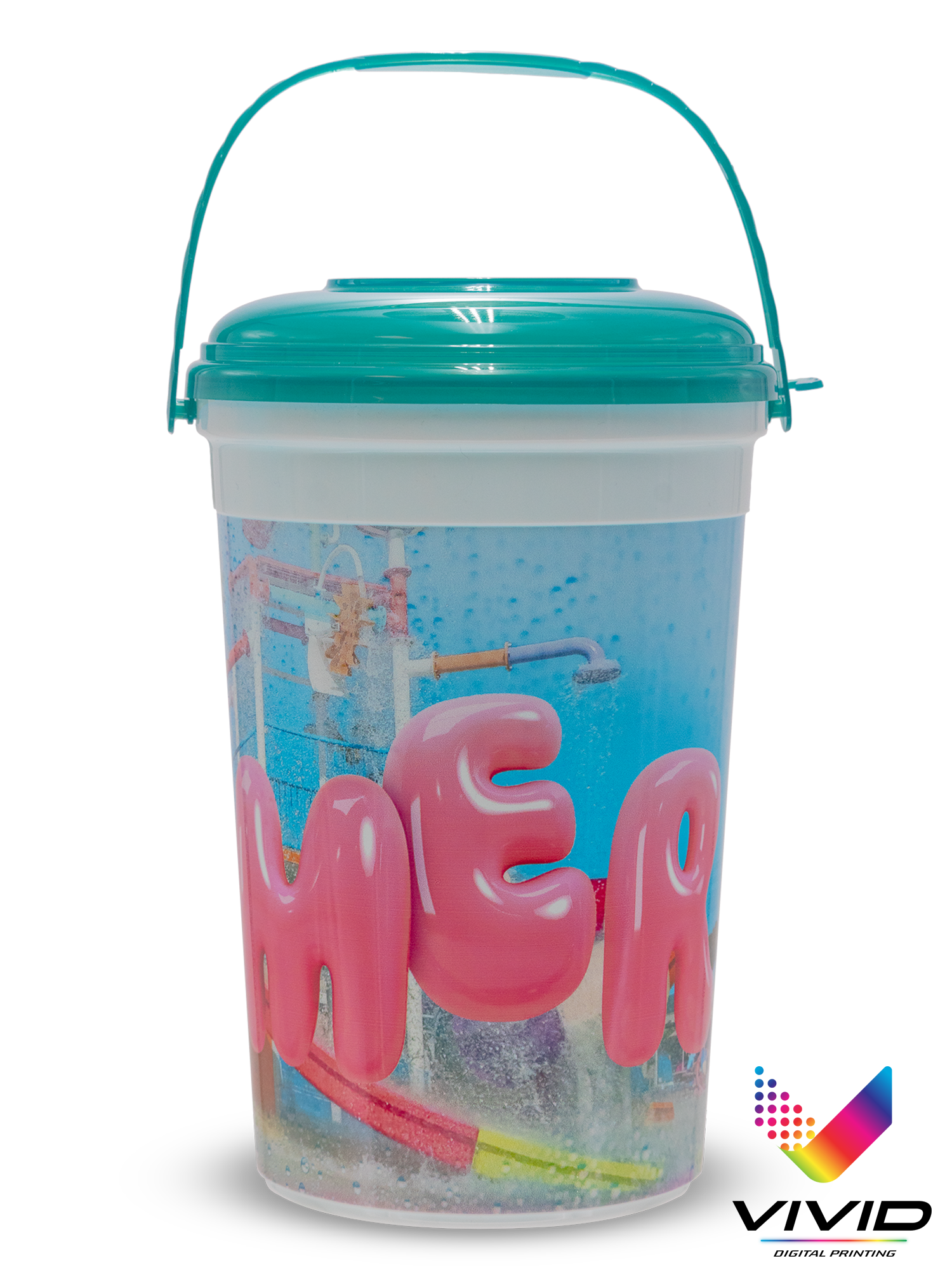 This new 85 ounce bucket with lid and handle is a larger version of our classic popcorn bucket. Buckets nest for easy shipment and storage.